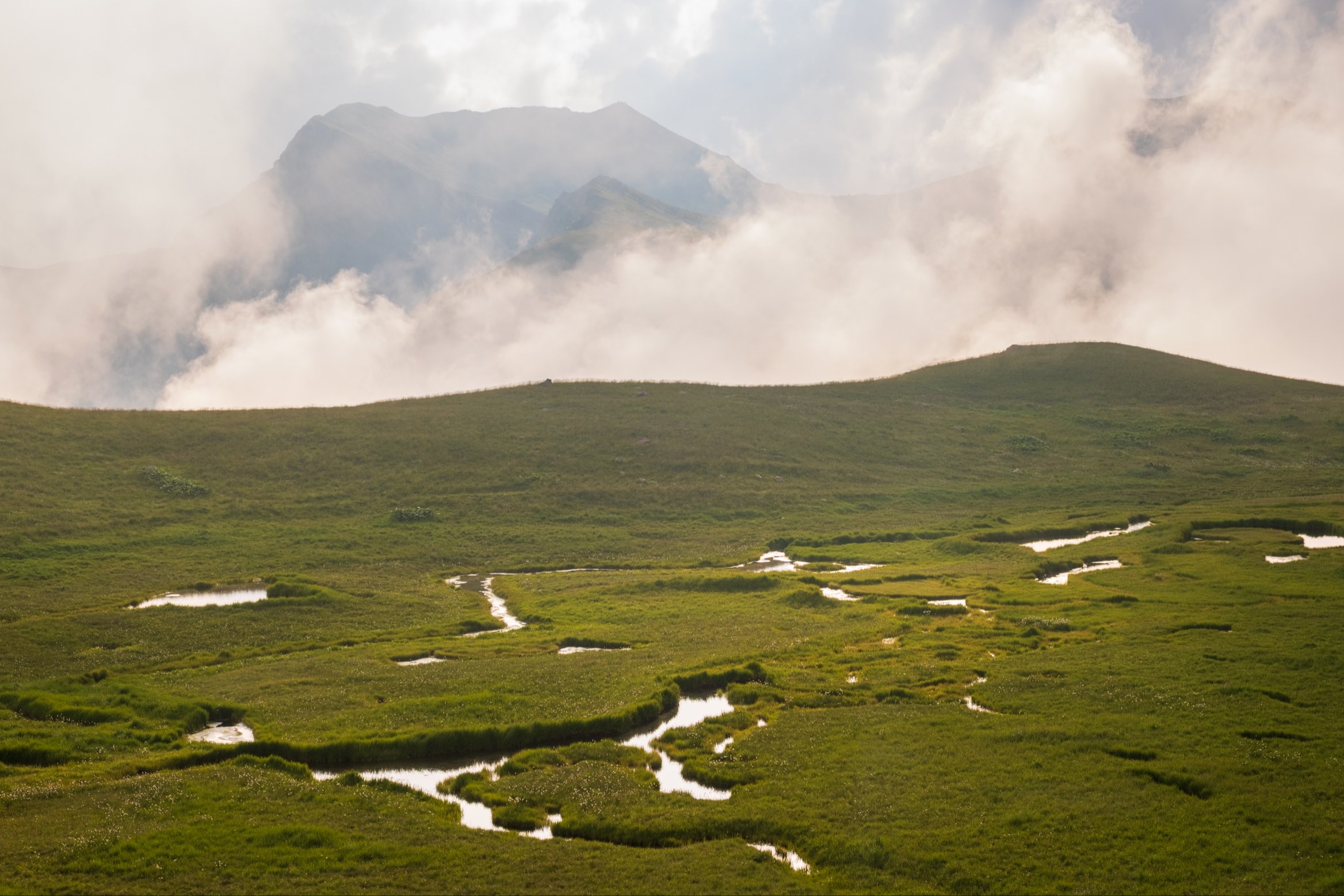 Pristine streams, glistening in the diffused light carve fresh ravines with peaks towering above. Fog dances and swirls across the landscape like tumbleweed through the desert. Raindrops drip from vibrant alpine wild flowers. Marshlands glimmer in warm light as escaping sun rays push through the thick cloud, and then the ground abruptly disappears, descending into steep mountain slopes.