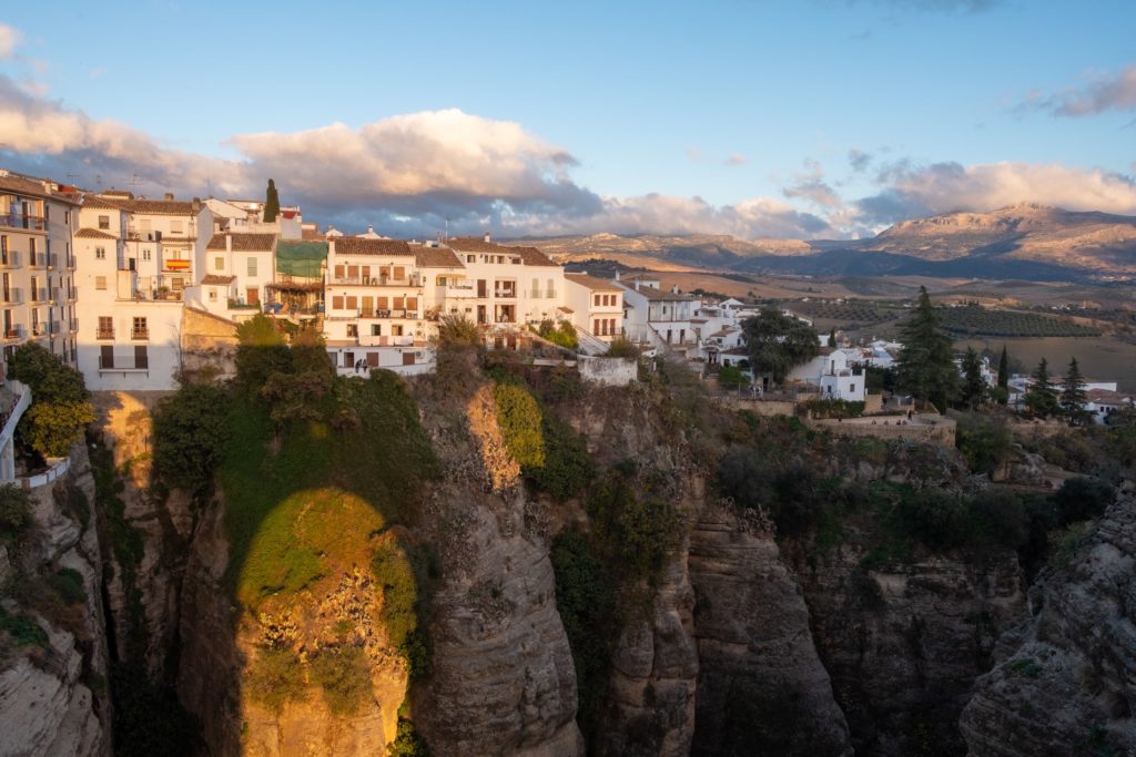 We grab a beer and take a seat at Mirador de Ronda, it’s not very busy, probably because it’s winter. We imagine it will be much more bustling in the summer. Brilliant yellow and orange hues light up the sky and a lady plays traditional folk music on an acoustic guitar. Couples lean against the railings watching the sun dip down below the Sierra Nevada mountains. Another couple lean on the railings, looking inwards, smoking cigarettes, appearing completely unimpressed.