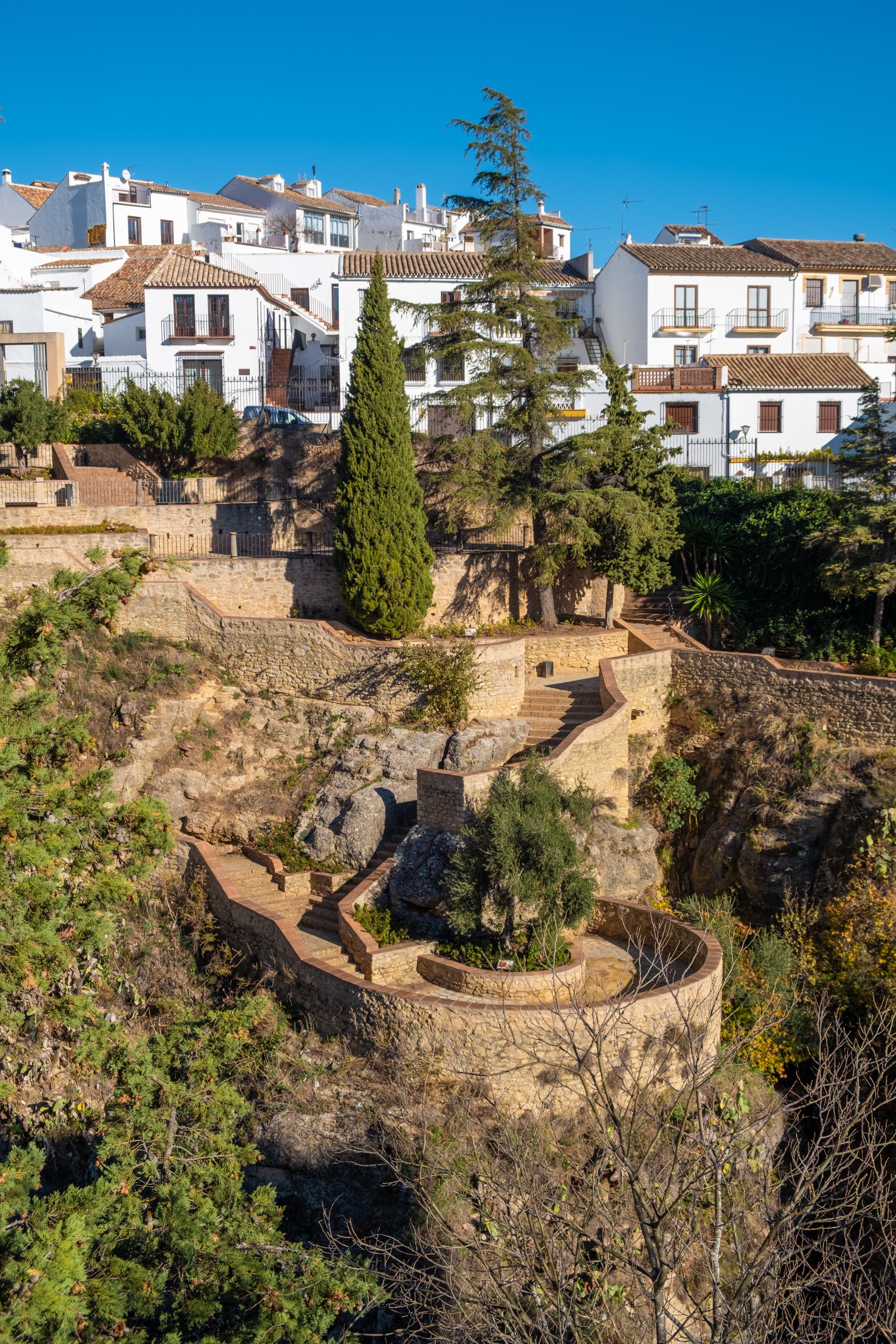 The house of the Moorish king, only it wasn’t, because it was built after the Moorish empire was defeated during the Christian Reconquista. It was built in the 18th century and the gardens, even more recently in 1912 by French landscape gardener, Jean Claude Forestier. The construction does include one important antique built by the Moors: the water mine. In the 14th Century, during the frequent Christian besieges, the Moorish king commanded the carving of steps in to the stones walls of the gorge. In order to supply the city with water. It was subsequently built by Christian slaves who came to know that in Ronda you die carrying water skins.
